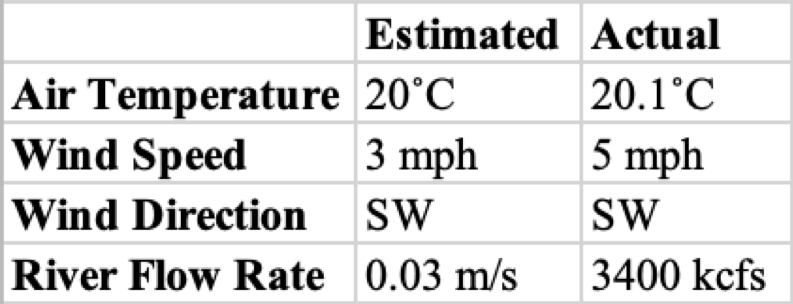 General descriptions of the Apalachicola River, Chattahoochee, including wind speed/direction (actual and estimated), air temperature, water flow, GPS location, and flow speed were measured. Estimated and actual wind direction was SW with an estimated speed of 3 mph and an actual speed 5 mph. The GPS location was measured to be 30°42’19.66″ N -84°50’44.66″ W and velocity (flow speed) was 0.03 m/s. This data is also partially represented in Table 1, below. The river was recorded to be generally still, slow, and flooded overall.